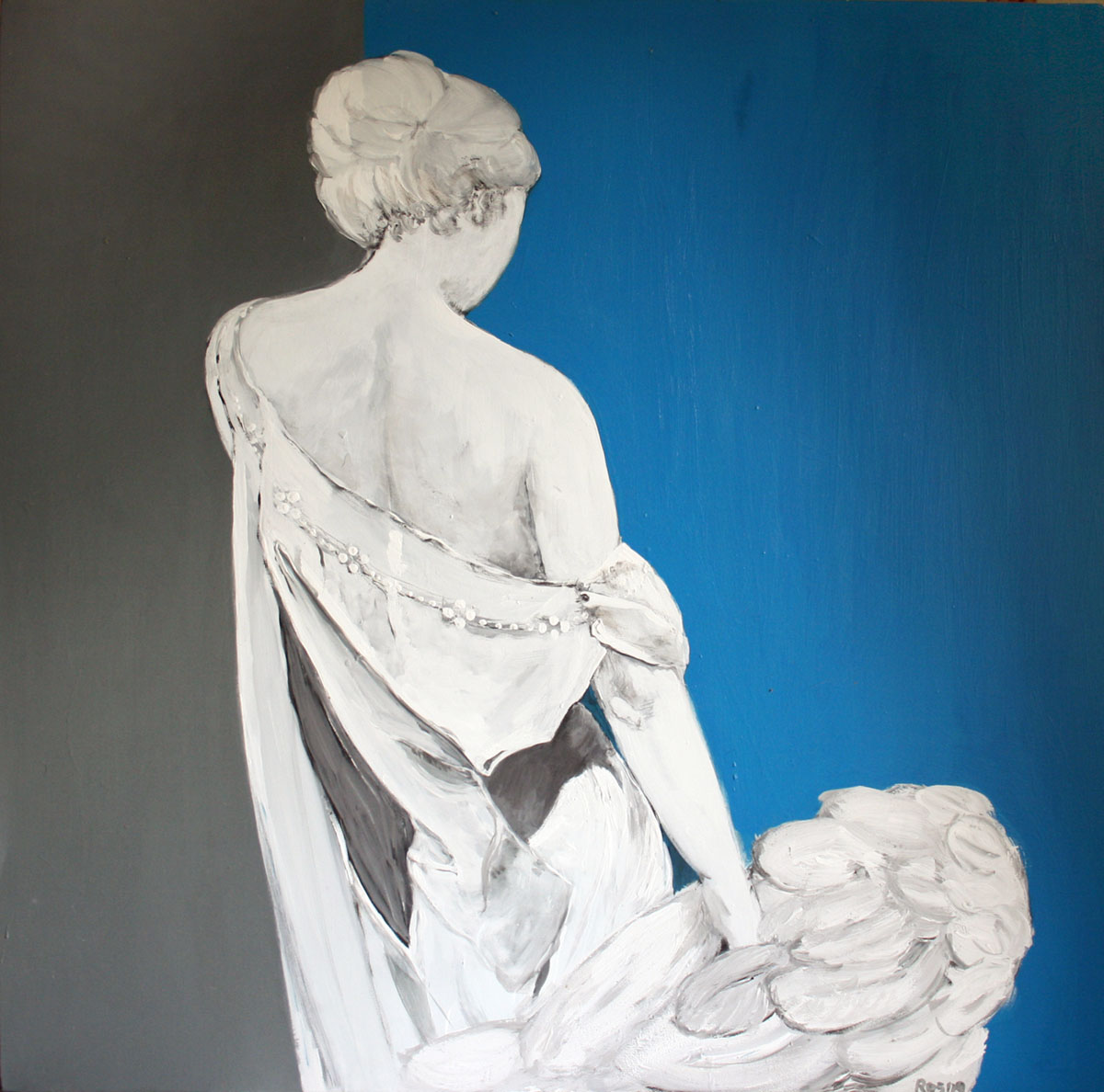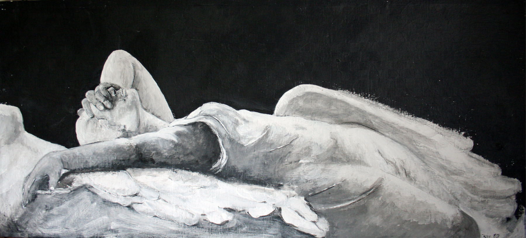 Erschöpft liegt ein Engel auf seinem Federkleid und ruht sich aus.
