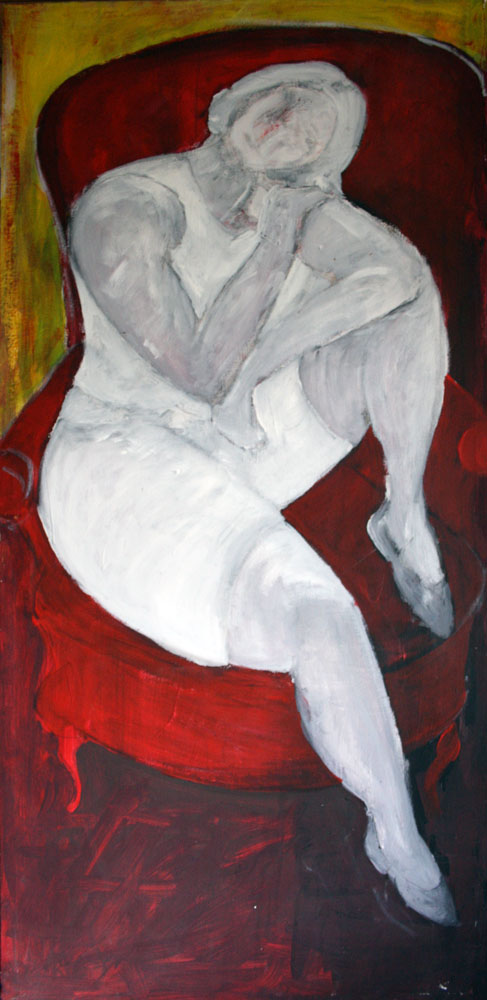 Ruhig und gelassen schmiegt sich eine Dame in den roten Sessel und lässt die Seele baumeln.